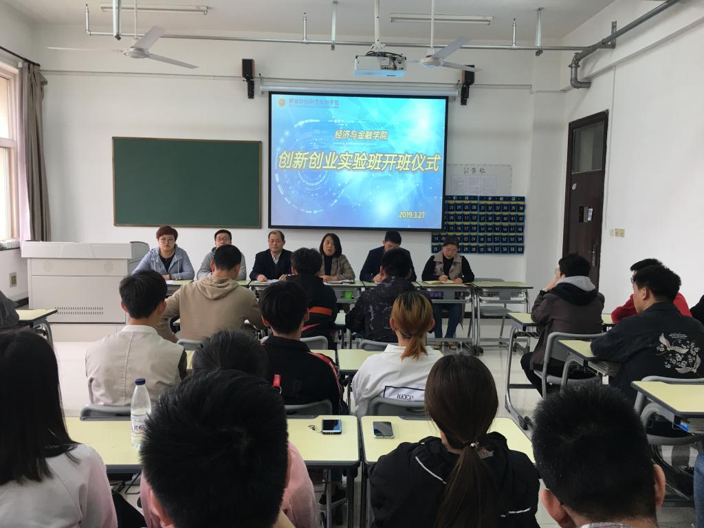 双创引领潮流,学子力展风采。为贯彻落实十九大报告关于创新创业人才培养的新要求和高等职业院校创新发展三年行动计划,推进创新创业试点院系工作,3月27日下午5点,经济与金融学院举办了首届创新创业实验班开班仪式。经济与金融学院院长景海萍、党总支书记曹耀辉、副院长陈冬、创新创业青年教师李曦和王莲云、学生科辅导员张欣瑞、许斌、何蕾及学生会创新创业部和创新创业实验班全体同学参加了此次开班仪式。大会由何蕾主持。