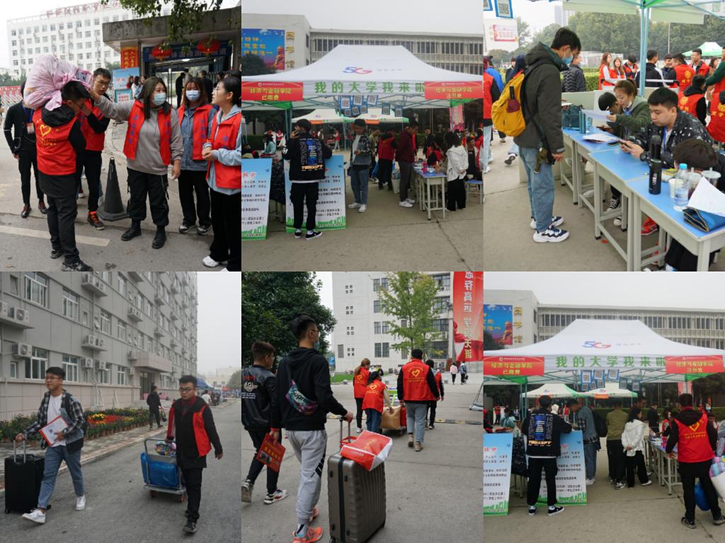 10月9日上午,经济与金融学院的学长学姐们和穿着红马甲的志愿者们早早到达了迎新处开展工作,新生报到在实训楼前进行,帐篷也从校门口搭到了实训楼前,每个帐篷下面都贴了各个学院的名称和专业,让学弟学妹们一目了然,学长学姐们引导新生扫码进群,登记信息,随后穿着红马甲的志愿者们带领新生到各自的宿舍楼前,并主动帮他们提行李,耐心的回答新生提出的各种问题。迎新工作如火如荼进行着,校园里随处可见他们忙碌的身影。
