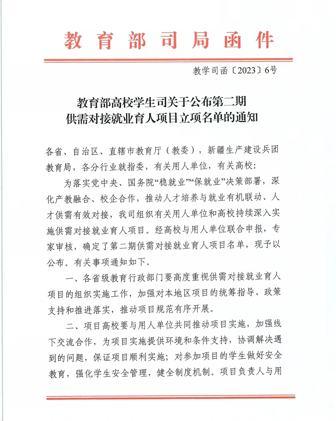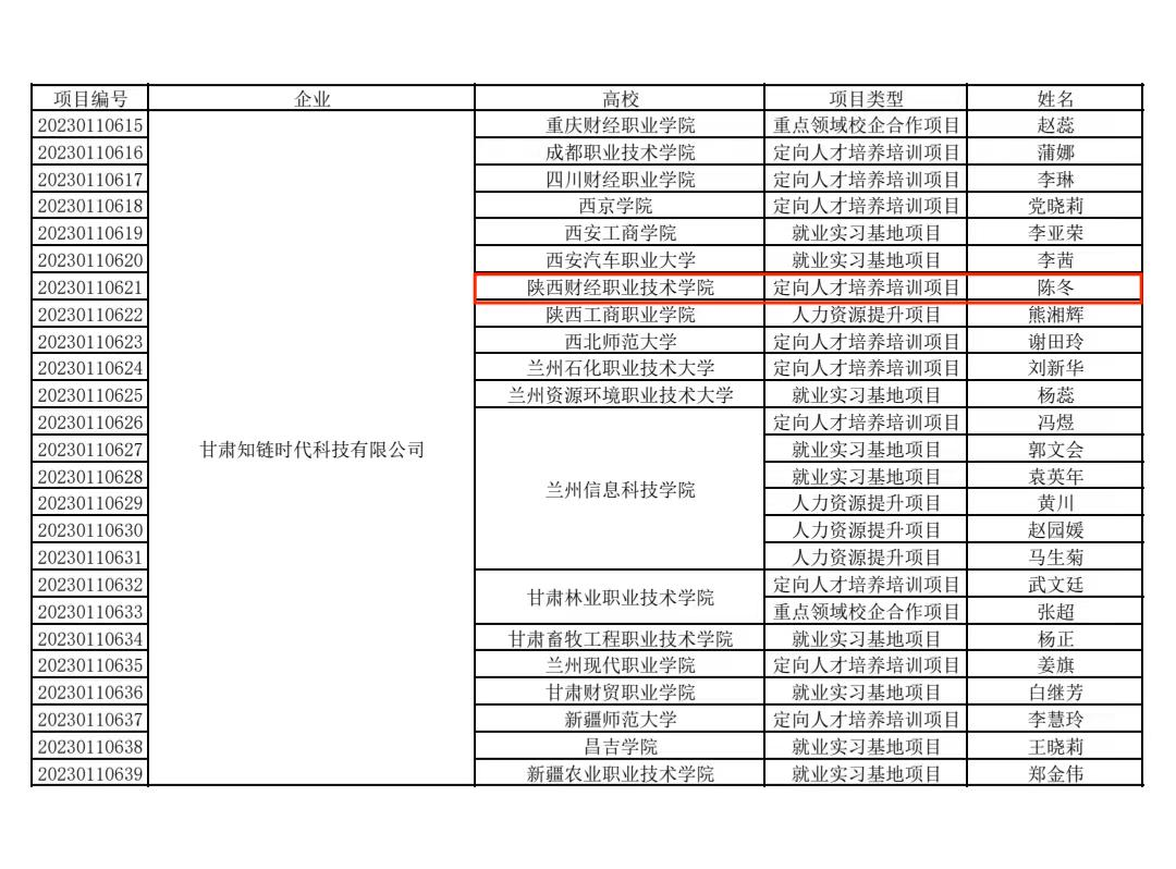 为落实党中央、国务院“稳就业”“保就业”决策部署,深化产教融合、校企合作,推动人才培养与就业有机联动,使人才供需有效对接,教育部组织有关用人单位和高校实施了系列供需对接就业育人项目。经高校申请、用人单位申报、专家审核、立项单位信息核查,2023年4月6日,教育部高校学生司发布《关于公布第二期供需对接就业育人项目立项名单的通知》(教学司函〔2023〕6号),我院申报的项目成功入选供需对接就业育人项目立项名单,对接单位为甘肃知链时代科技有限公司,企业承诺给予学院10万元等值的软件及技术服务支持。
