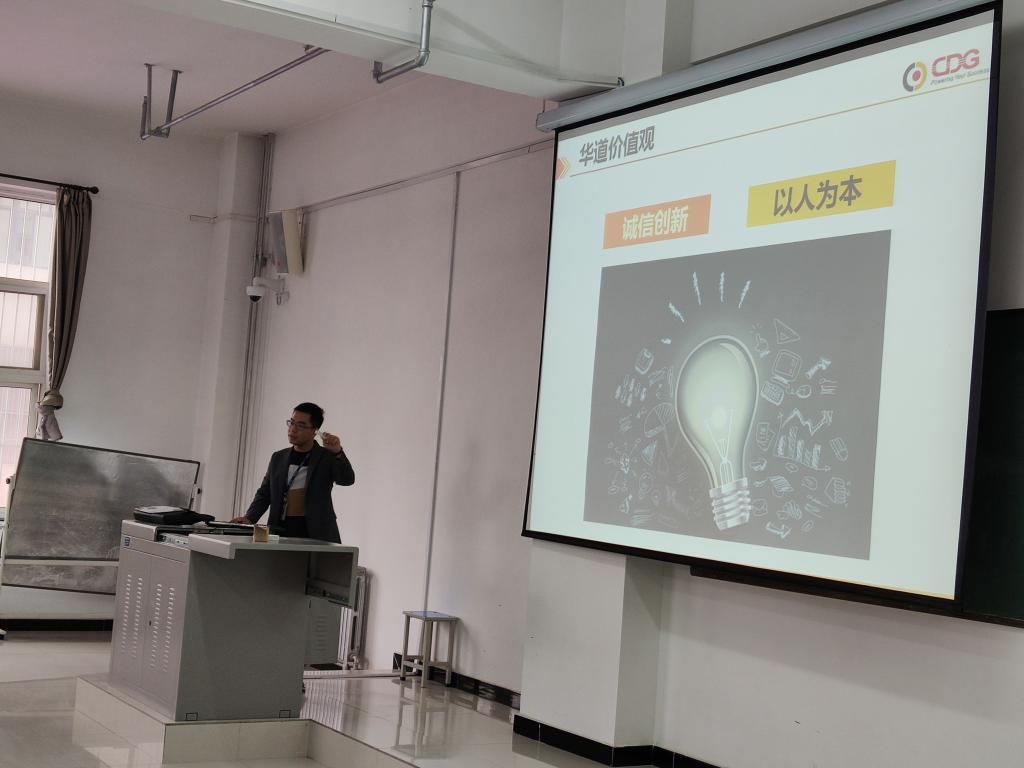 华道公司西北地区负责人曹小龙,就华道公司的背景、业务范围、岗位需求、岗位职责等多方面做了详细的介绍。其间,对于同学们关注较多的住宿环境、薪资待遇、个人发展等问题做了详细解答。