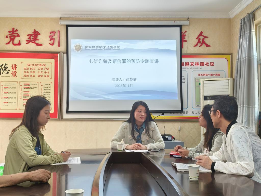 为进一步增强居民的防诈骗意识,强化法治观念和自我保护意识,切实维护居民群众的财产安全。2023年11月13日,经济与金融学院团总支副书记张静瑜前往文林路社区开展“电信诈骗及帮信预防”专题宣讲活动。