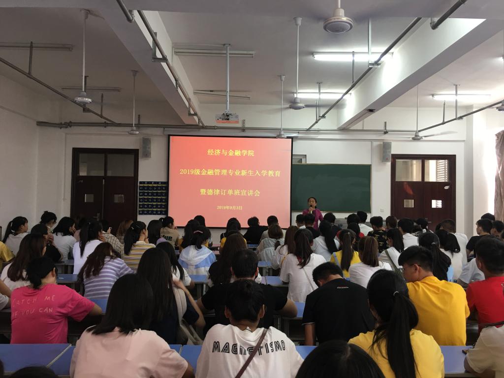 景海萍首先对2019级新生表示了热烈的祝贺和真诚的欢迎,随后她着重介绍了经济与金融学院的发展情况、办学规模、专升本、就业情况等,并希望全体新生能够充分利用时间,做好职业生涯规划,打好专业基础,学会踏实做人、精彩做事。陈冬分别从金融管理、互联网金融等专业的历史沿革、师资力量、教学成果、“企中校”联合培养订单班等方面作了详细介绍,并着重介绍了各专业的课程设置、教学模式、就业前景等情况,他指出入学教育是大学生涯的第一课,期望全体新生能够认真听取企业代表的宣讲,全面深入地了解合作企业,并结合自身情况,积极报名“德律订单班”。