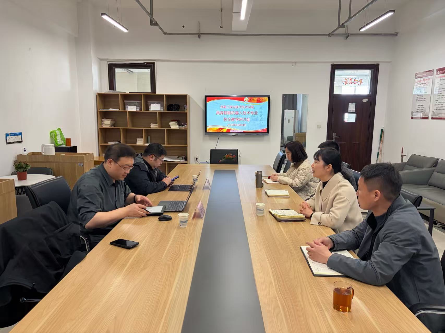 为深度推进产教融合创新、构建校企协同育人新生态,精准锚定行业高质量发展对高技能人才的迫切需求,2026 年 3 月 4 日下午,智元创新(上海)科技股份有限公司科研教育系统部总监沈绍峻、智元南区销售总监焦成林应邀莅临我校金融工程与现代技术学院,围绕具身智能机器人技术专业人才培养体系构建、专业内涵建设等核心议题,开展交流洽谈。金融工程与现代技术学院院长杜逸冬、副院长李科峰、党总支副书记许斌以及工程系主任吝代代参加座谈。
