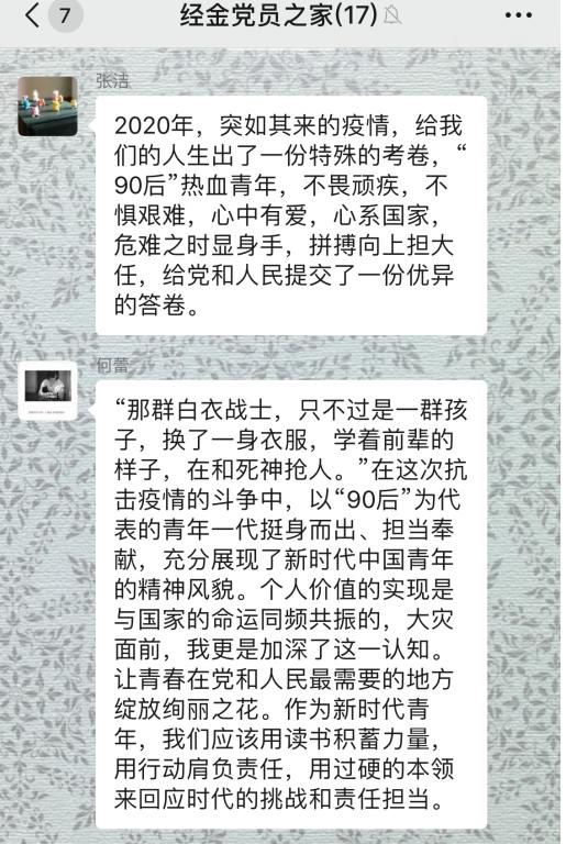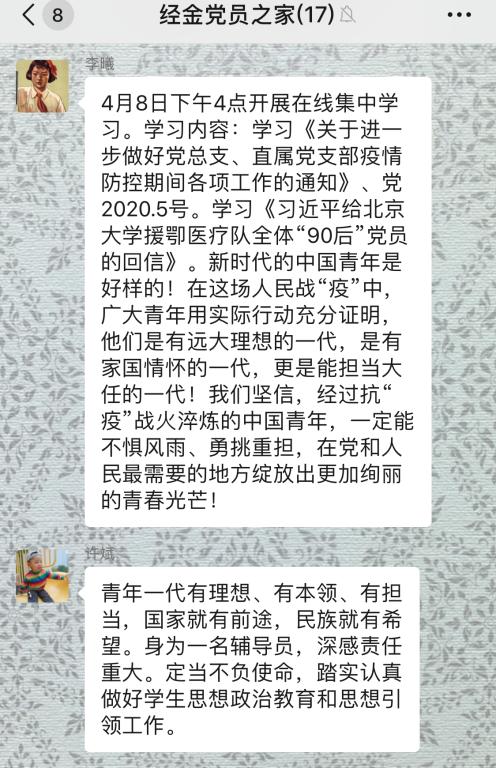 4月8日下午4点,经济与金融学院党总支借助企业微信平台,组织了线上集中学习会,热议习近平总书记勉励北京大学援鄂医疗队全体“90”后党员的回信。