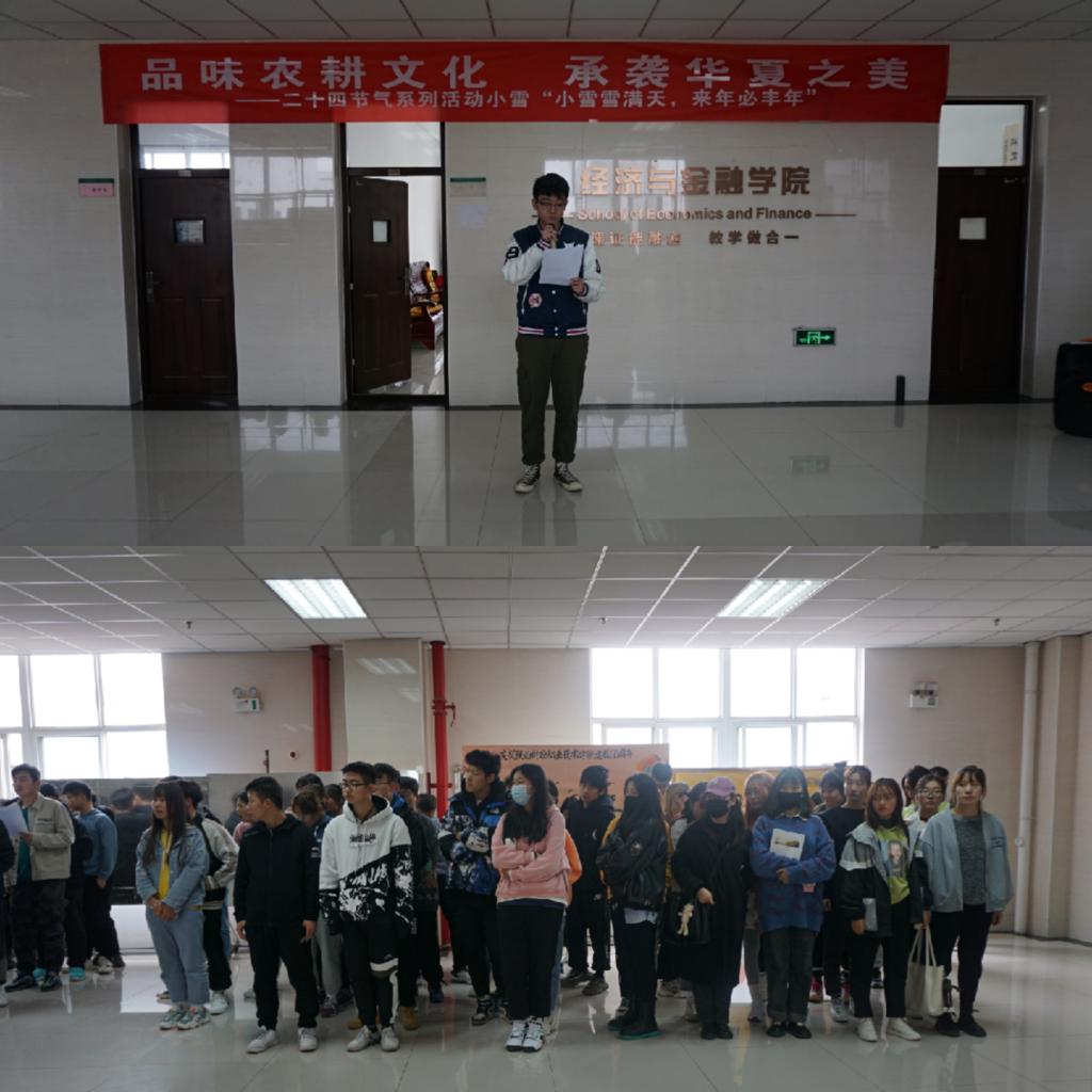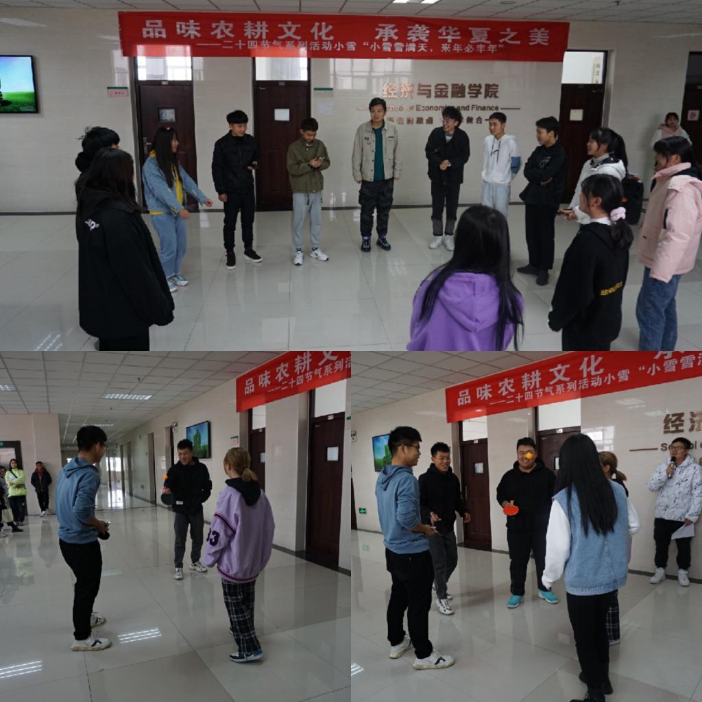 为了培养同学们的体育锻炼精神,营造良好和谐的校园氛围,同时,为了发挥”向日葵”育人计划的最大优势,丰富第二课堂校园文化。经济与金融学院团总支于2020年11月20日11点30分在综合楼七楼大厅举办二十四节气之小雪文化活动之趣味运动会。参加本次活动的有经济与金融学院全体学生。本次活动由童一诚主持。