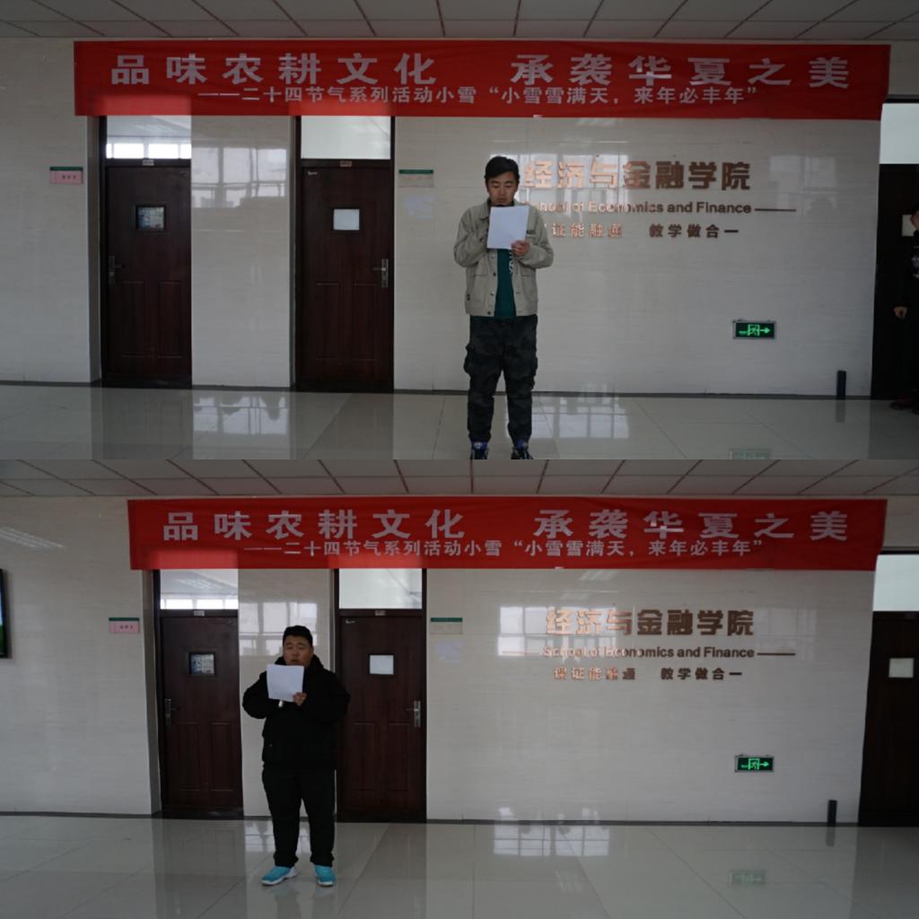 活动开始前,由主持人向大家介绍有关小雪的相关知识及活动背景。活动开始,首先由20级工程造价三班张重烨和谭睿宇同学为大家带来了小雪的诗词朗诵。通过诗句向大家描绘出了雪花飘零的景象,将大家带入了大雪纷飞,白雪皑皑的意境,也让同学们对冬天的第一场雪更加期待。随着节目的进行,同学们渐入佳境,活动的氛围也逐渐活跃起来。