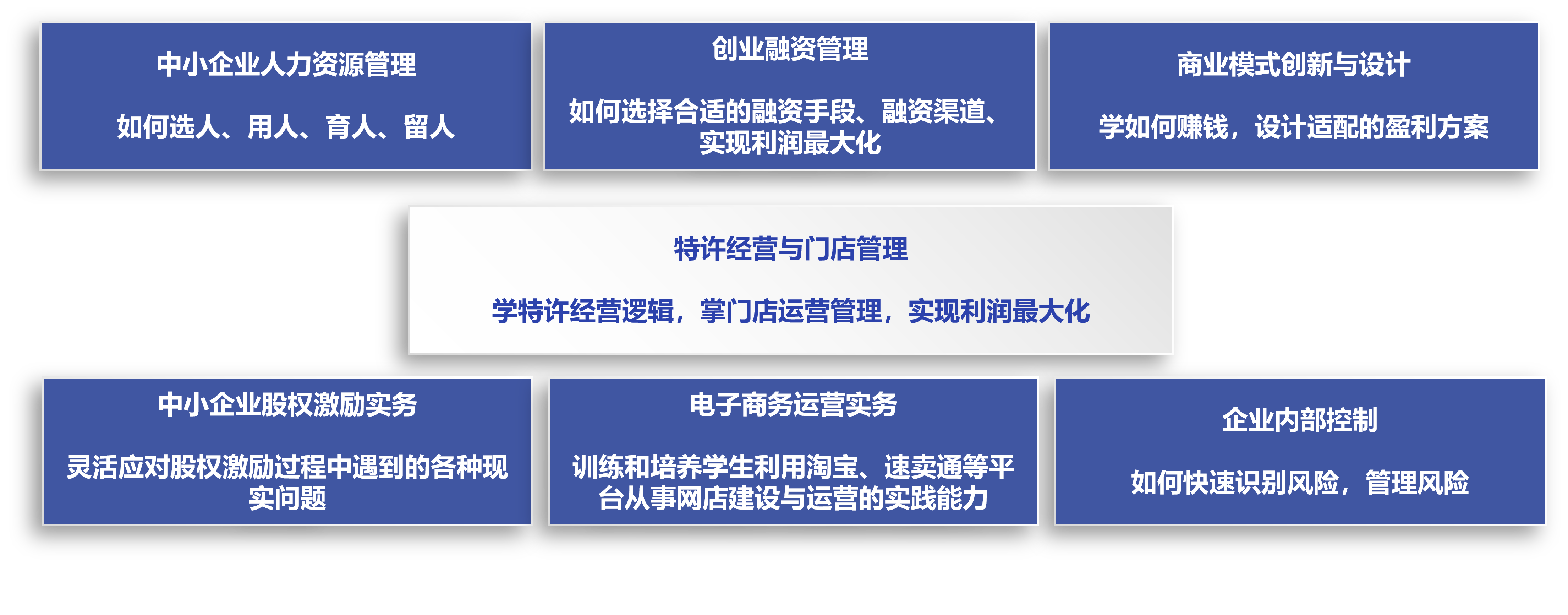 专业核心课程包括中小企业人力资源管理、创业融资管理、商业模式创新与设计、特许经营与门店管理、中小企业股权激励实务、电子商务运营实务、企业内部控制等。